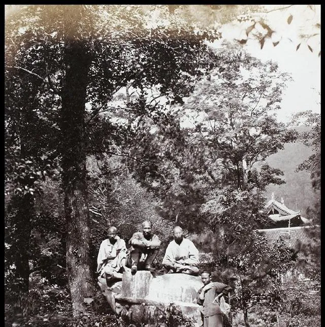 图里几位穿长衫的人坐在石头上,后头露出寺庙的屋脊,这一幕就叫林间歇凉,有人拎着烟袋,有人把脚一伸,衣摆落在草叶上,风一过咝咝响,老一辈会在这儿掰指头聊今年的水路怎么样,谷价怎么样,话题简单,心不乱。