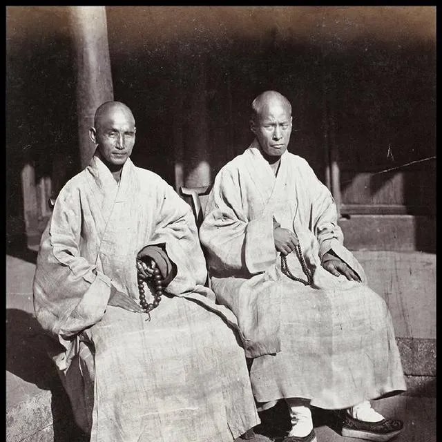 这两位僧人袍子是麻布色,手里各捻一串木珠,鞋是白底布鞋,坐姿正,眼神稳,师父说念珠不是摆样子的,一颗一颗过手,念的是心气,别急,急就乱了,和炒菜一样,火候对了才出味。