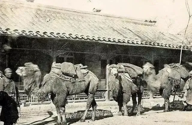 图中高大的双峰骆驼排成一串,这个厚实的驮鞍就叫骆驼鞍,木架裹着粗布和毛毡,侧面再搭两只皮口袋,装的不是盐就是布匹,驮绳勒在肚皮下,咔哒一扣就稳当了。