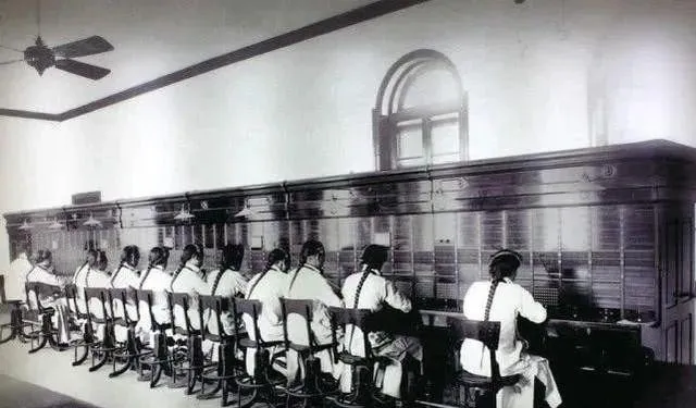 这排坐得整整齐齐的小伙子,辫子垂到椅背,这个戴在耳朵上的就叫听音耳机,前头那面大墙似的柜子,是交换台或电报机柜,上面密密麻麻的孔位和插线,手里一根线,另一头插进去了,指尖敲键的节奏像下雨。