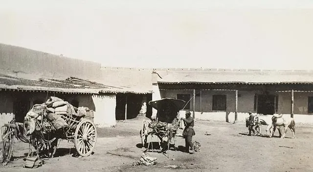 这处四合院样子的地方就是路边的客栈院子,土墙围起来,中间一大块空地,图里的两辆大车是木轮马车,辐条粗得像胳膊,车辕上缠着麻绳和皮条,行李用草垫盖着,夜里卸下来堆在屋檐下,伙计把火一升,铁壶咕嘟咕嘟,马往槽里凑鼻子,嚼得慢条斯理,小时候我在乡下也见过这种车,推一下轮子,木头轻轻吱呀,那声音比钟表还准。