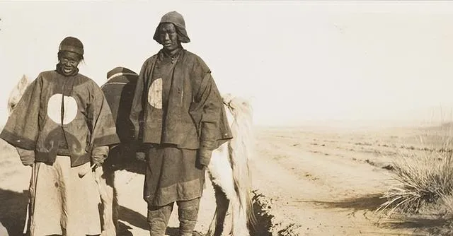 这个衣服上的大圆补丁叫醒目补,主要是赶路人和脚夫穿,黑布坎肩上缝一块浅色圆片,远远就能辨认伙伴,布多是土机织的粗棉,袖子宽肥,口袋偏低,腰里别一把短鞭,走在风口地儿,脸被晒得黑亮黑亮的,嘴角抿着砂子味,路边的草丛一簇一簇,影子像水波一样抖。