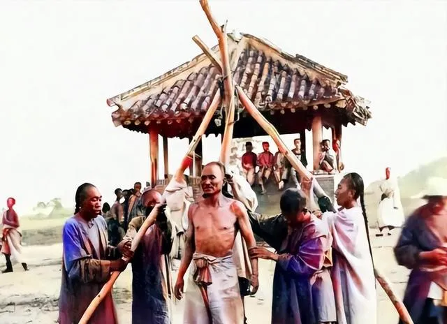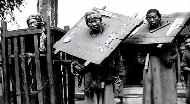 这个木板叫大枷,前襟被压住动弹不得,板角上贴官文,字迹被雨水泡开,旁人探头看两眼就走了,旧时惩戒讲究看,看就是警,现在是摄像头看人,人也学会不抬头。。