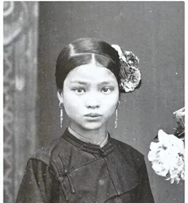 图中女子叫馆照闺影,头发抹得光亮,耳畔一对细长坠子,衣襟暗纹规整,花簪别在鬓根,眼神却有点怯,我妈看了笑,说那会儿拍照稀罕,谁都绷着,美在不动声色。。