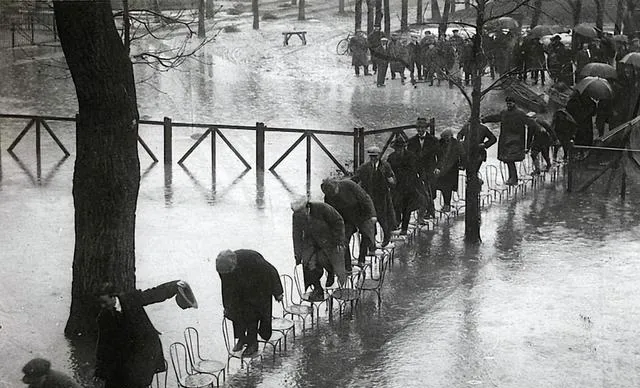 这个办法叫搭椅为桥,一把把铁椅排成线,帽子按着不让雨掀翻,队伍拐过树身继续往前,脚尖点在椅面上像打拍子,城市遇难的时候,总有人用笨办法把日子扛过去。。