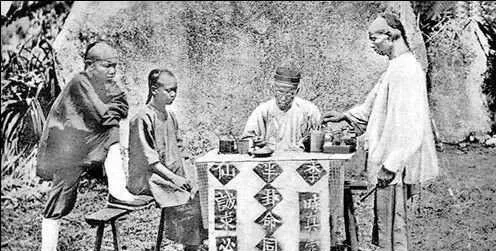 这张桌子铺着八卦旗的叫算命摊,中间一盏小油灯,两边摆着铜钱和竹签,半仙先生低头写字,旁边的年轻人凑上去问个来年运势,老照片上看不见笑话,只能听见耳边有人嘀咕一句,“求个心安呗”,以前遇事没处问,就找个懂门路的算上一卦,现在手机一搜全是答案,可真真假假又是另一回事。