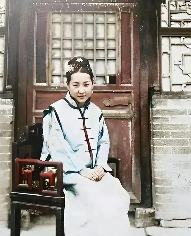 蓝灰色便服旗装,门口木窗做背景,线条简单干净,脸自然就柔和了,以前影楼非要金枝玉叶的布景,现在手机随手一拍,反倒更出质感,时代风气一换,美的尺度就松动了。