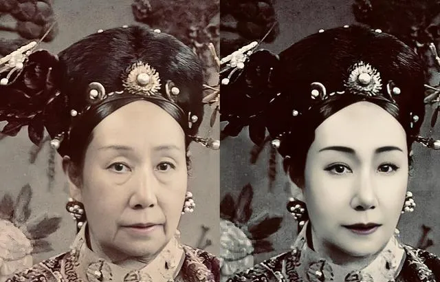 左边老底片有颗粒有岁月,右边做了磨皮提亮,法令线淡了,肤色匀了,你看吧,美就从阴影里翻出来了,要是当年也有这手段,何来“史上最丑后宫”的笑谈。