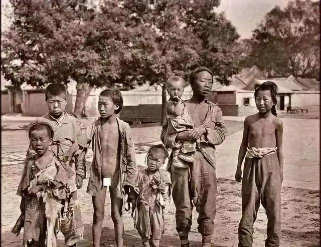 图中这一家人叫“逃荒户”,脸上全是土,身上挂的不是衣裳是补丁,男的抱着娃,几个孩子瘦得出棱角,眼神木木的,身后是树荫和远处的屋檐,看着像城边集市口,奶奶说那年头要是赶上旱灾,地里颗粒无收,衣不蔽体就不稀奇了,能捡到点糠皮掺野菜就是好日子。