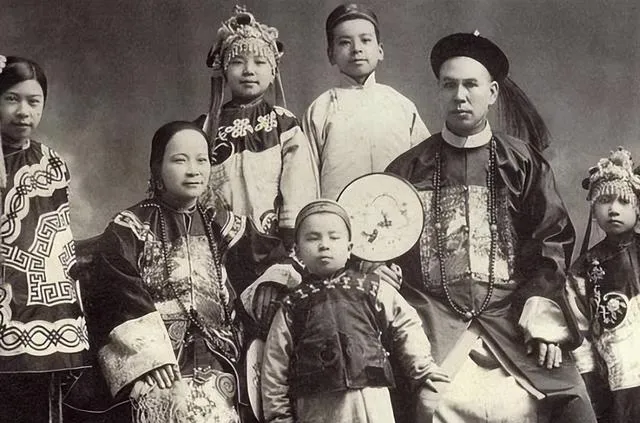 这张合影叫“阖家福”,男主人戴顶带,黑缎官服亮得能照人,胸前挂着一串长长的念珠,女人衣襟盘金线,孩子们的小马褂鼓鼓的,脸蛋白净,表情有点自信也有点拽,姥姥说能这样穿撮箍子戴绣花头面,家里肯定俸禄不薄,逢年拍张照放柜顶上,来客一看心里就有数。