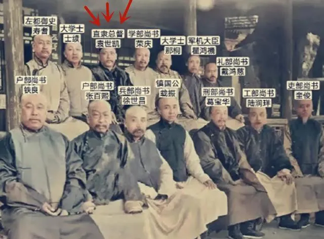 这张叫“朝臣合影”,长桌前一排袍服人,胸口别签,旁边还写了各自的官衔,位置坐得讲究,谁挨谁都有门道,照片里能认出来的名字不少,左多御史、军机大臣、各部尚书齐了个整,屋里光线打在面上,眉眼都显得拢着劲儿,外头风雨要下来了,屋里还在议章程。