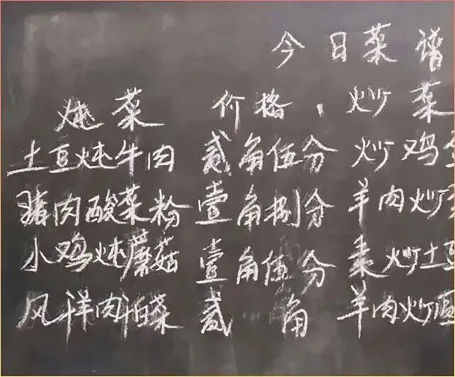 先.看这.张.让人惊掉下巴的黑板菜单。这是当年国营.饭店的价目表,那时候下馆子.可不是随便的事儿,得.有钱还得有粮票。仔细看那粉笔字土豆炖牛肉2角5分.,猪肉.酸菜粉1角8.分! 这意味着什么,意味着你手里攥.着1.块钱,能请三个哥们儿美美地吃上一顿有荤有素的.大餐,还能剩点钱买烟抽。那时候的物价.虽然.低,但每一分钱都透着老百姓辛勤劳作.的汗水,花起来那是真叫一个精打细算。