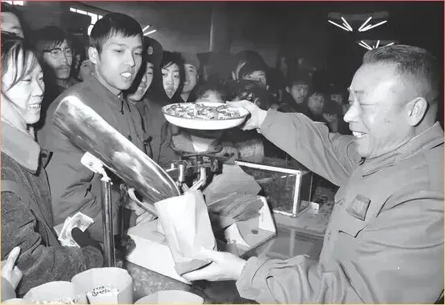 那时.候最开心.的事,莫过于.供销社来了新货,或者过年分点心。看.着这位售货员大叔笑得多.灿烂,手里正称.着散装的糖果饼干。那时候的包.装没有.现在这么花里胡哨,都是用那种粗糙的黄草纸一包,麻绳一系,.拎在手里沉甸甸的,透着一股子踏实劲儿。 围在旁边的顾客,眼神里满是期待,.那种对物质最朴素的.渴望,是现在物质过剩年代.的人很难体会的。