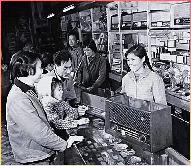 当然,70年代也.有当.年的奢.侈品。看看这家商店的柜台,摆的是什么,.是收.音机.!在那个年代,.这就是妥妥.的高科技产品,是.家庭富裕的象征。 谁.家要是有一台红灯牌收音机,那在邻.里街坊间可是.相当有面子的。这东西在当时得卖几.十块甚至上百块,相当于普通工人好几个月的工资,1块钱在它面前确实显得微不足.道.了。 年轻人趴在柜台上,眼神里流露出的那种对新潮事物的向往,.和现在.年轻人排队买最新款手.机其实是一样的。