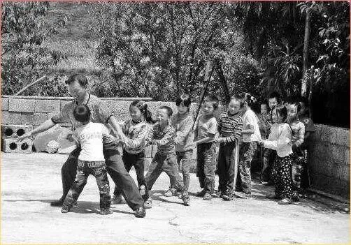 那.时候没有补习班,没有.iPad,放学后或者.放假了,全村的孩子就像放羊一样聚在一起。这张.照片.里,像是在玩老鹰捉.小鸡,又像是在拔河或者某种集体游戏。