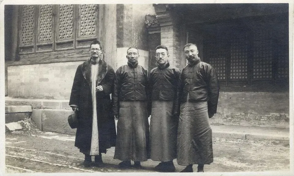 合影四人身后的建筑,左侧建筑规格较高,四扇窗,直斜棂交织,右侧应为附属连接建筑,直棂窗。地面有起伏坡度。