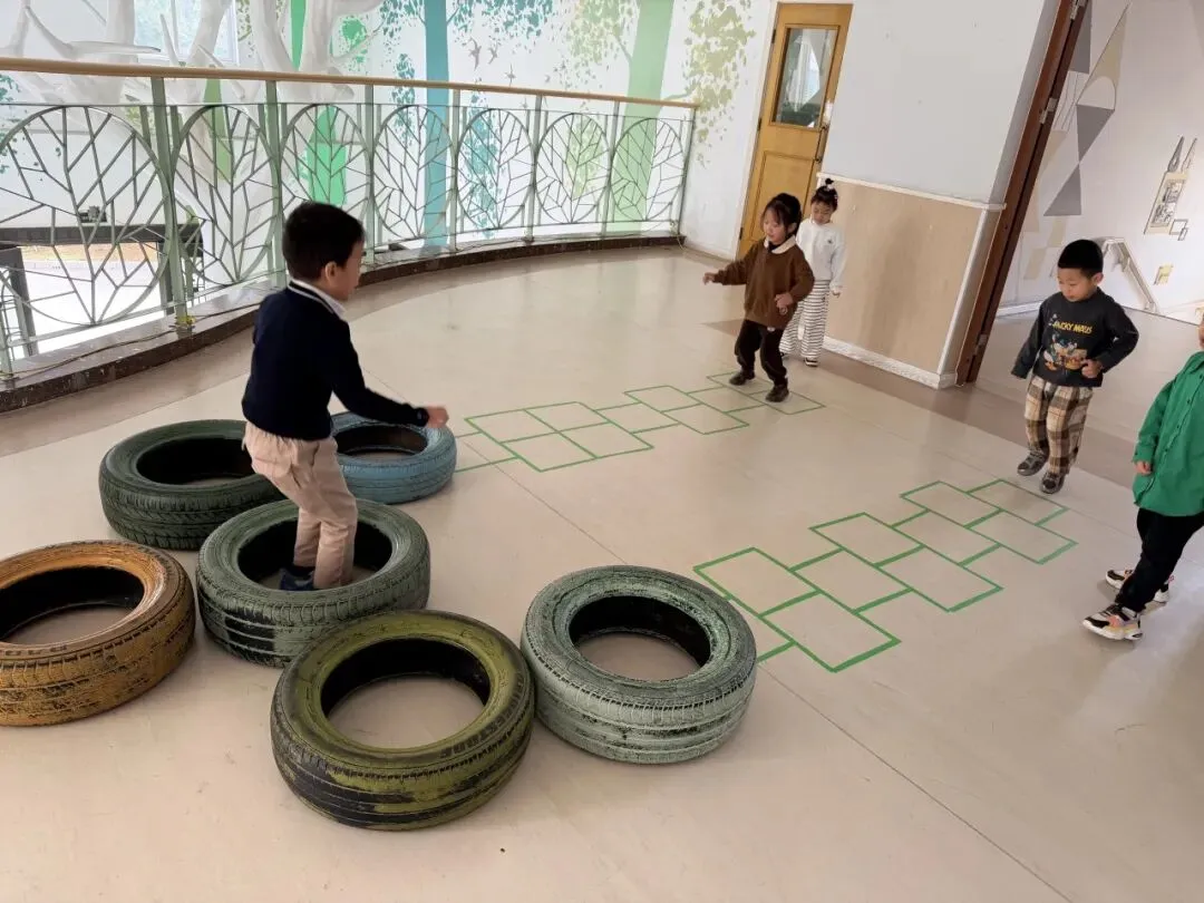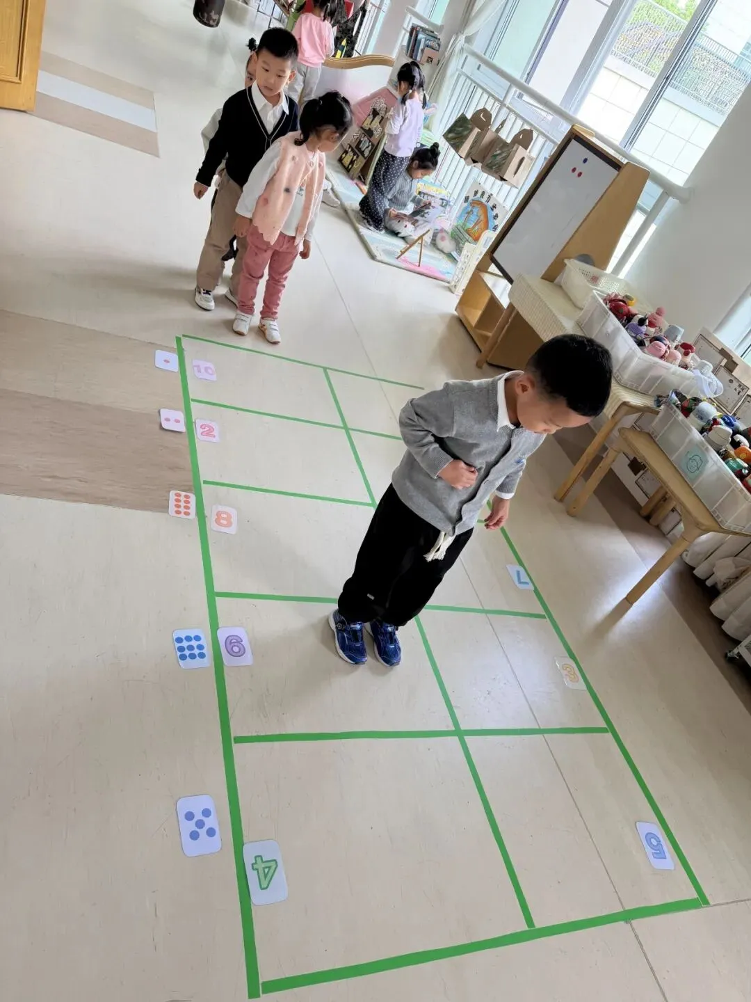 跳房子之“创新”,“替代材料”环节是一种游戏经验的迁移与拓展:从平面到立体,有了距离、高度、方向等不同维度的改变。将游戏和学习有机融合,支持幼儿在游戏中学习。通过个别、小组和集体等学习形式帮助幼儿在跳房子游戏中巩固理解10以内的数、量及数量关系,提升思维的逻辑性,赋予“跳房子”更丰富的教育内涵。