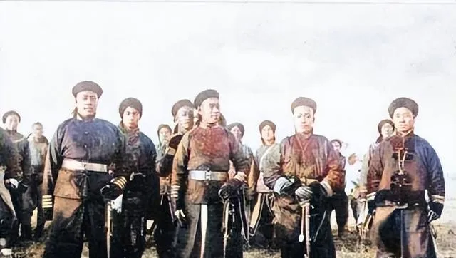 图中这群穿黑蓝号褂的叫新军军官与哨官,腰间系皮带,手里攥着佩刀或手杖,衣料是厚呢子混着棉布,袖口和领口都加了滚边,远看挺齐整,近看又能见补丁的针脚,站在草地上风一吹,帽檐微微颤,像在硬撑着体面,奶奶说她爷爷见过这样的队伍从城外操场回营,号声一响,孩子们追在后面看热闹,可心里也知道,这身行头挡不住洋枪的火舌。