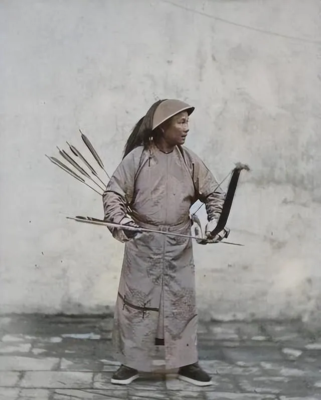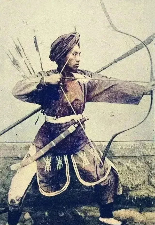 图中这位拉满弓的叫旗兵弓手,弓背厚黑,箭羽成扇,腰间插着弯刀,裤腿边缝着白边装饰,姿势是标准的开弓不回头,袖子鼓鼓当挡风,想象一下在城门口的射艺校场,弦响一下就把周围的鸽群惊起,可那时候西方的后膛枪已能连发,弓再精也慢半拍。
