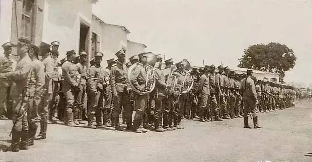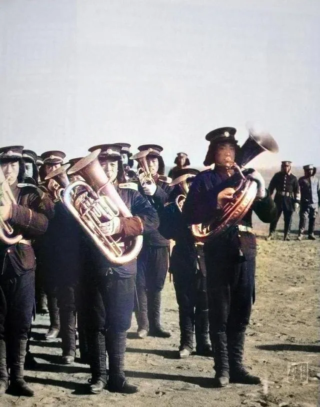 这个排着长队的是陆军操演,铜号鼓在最前头,后面肩枪立正,地上扬起的土像烟一样,口令短促,节拍紧凑,小时候我在村小操场学过举枪礼,那种木枪砸到肩窝的钝痛,现在回想起来,倒有点像这张照片里的味道。