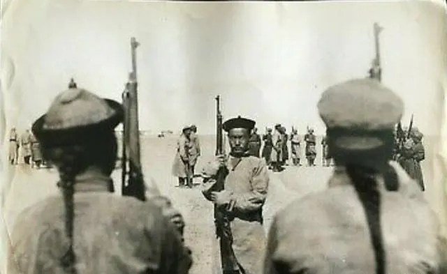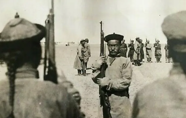 仍是操枪的画面,前景两条辫子晃着,说明剪辫的风气还没完全来到,远处站着的像是带哨,手里小旗一挥就换队形,以前靠口令旗语,现在扩音器一吼就够了。