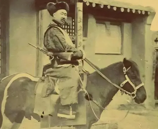 这位骑在小个子马上的从人,皮帽厚耳,腰后塞着火铳,腿挟得紧,马鞍垫是硬板,走久了能把人颠得直叫苦,以前官门口少不了这号人影,现在只剩戏台子上还能见个影儿了。