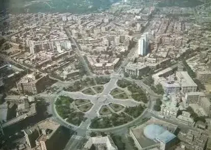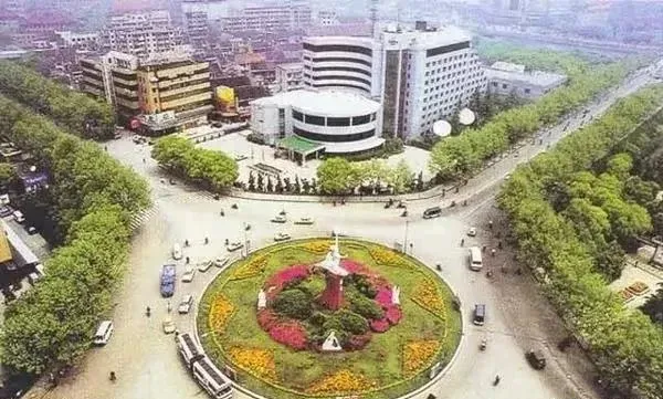 这张是老城航拍的大转盘,几条大道像扇骨一样伸出去,圆心里多半是花坛或雕塑,爸爸讲过当年学骑车在这练绕圈,胆大心细才不被按喇叭。