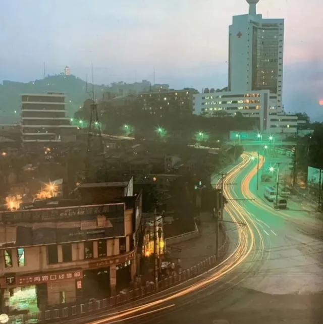 照片上这条弯弯的绿灯带,是长曝光留下的车灯轨迹,路边楼还不高,霓虹倒挺精神,小时候我们看着它流过去,就觉得城里真会发光。