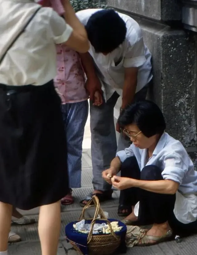 这个竹背篓里多半是发绳扣子针线,摊主蹲着手脚麻利,顾客围一圈挑挑拣拣,价钱就几毛几角,话却要说半天,砍来砍去图个痛快。