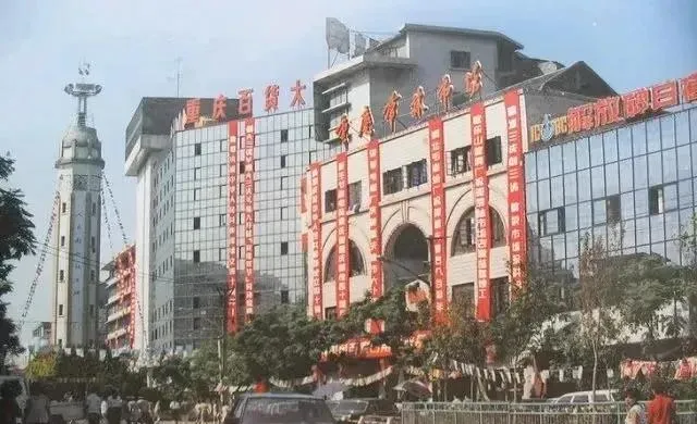 这排大楼上横幅密密扎扎,写着促销和迎新春,喇叭在门口放流行歌,楼里有国产手表电风扇和搪瓷盆,我记得跟着妈妈挤过年货大集,手里攥着钱票,心里打鼓怕够不够。