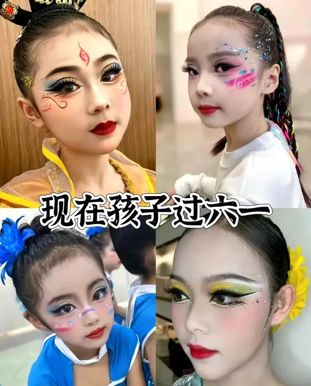 这张是现在孩子过六一的妆容,亮片、水钻、彩色眼影,一早上化妆比排练还费劲,孩子们可漂亮了,舞台灯一打,眼睛跟小星星似的。
