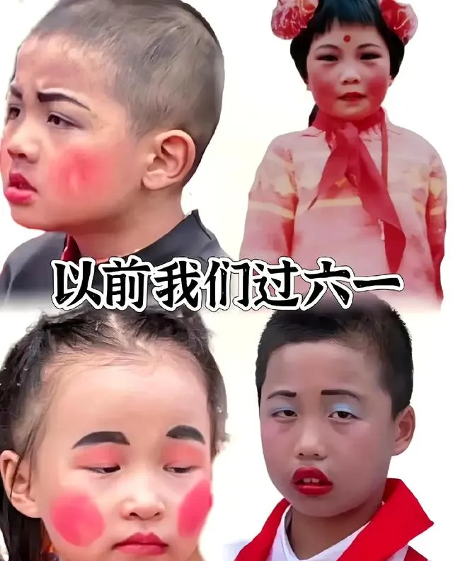 这张是我们那会儿的六一,脸蛋抹两团大红,眉毛一横,嘴唇一抹,像从粉盒里蹦出来,妈妈笑我像唱秦腔的,我还不乐意摘,非要顶着去吃冰棍,凉风一吹,腮红糊成两条。
