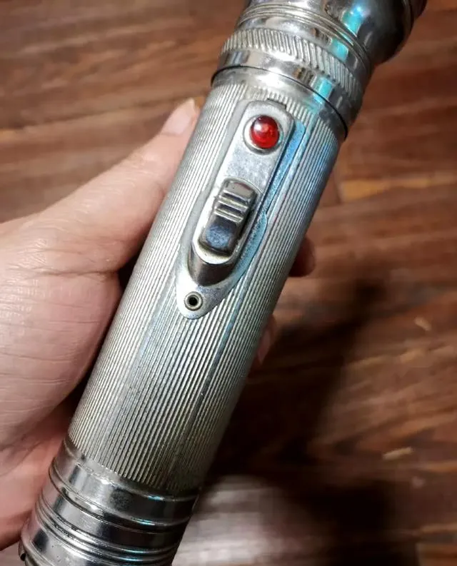 图里这金属壳手电筒,推子向前一推就“开灯”,红色小圆点是指示灯,晚上停电全靠它,拿在手里沉甸甸的,电池漏液了还会在掌心留一层黑印。