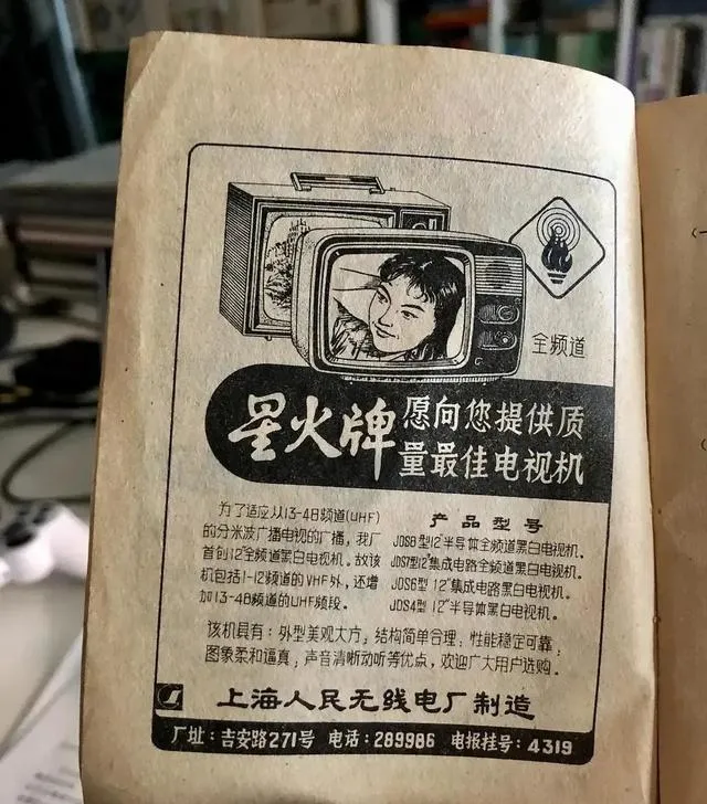 这个黑白插图是星火牌电视广告页,小姑娘笑在显像管里,左上角画着全频道字样,妈妈说当年看见这页广告心都动了,可那会儿工资本就紧,把买电视的念头压在抽屉底下,先攒票再攒钱,等买到第一台时已经是彩电了。