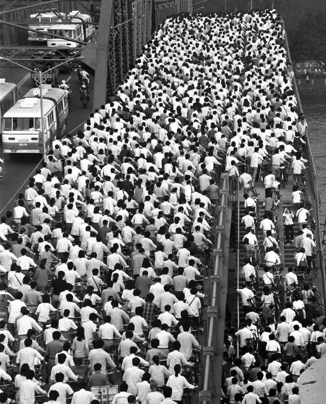 这片白衬衫的浪叫上班潮,密密麻麻都是自行车,车铃叮当一片像乐队合奏,以前上桥是抢道,现在堵车是抢时间,节奏变了,人还是那样往前挤。