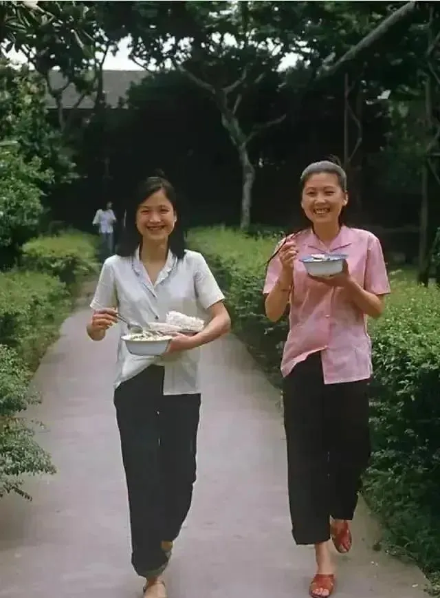 这两碗白瓷盆里是食堂饭,一个夹菜一个扒饭,笑容比菜香更招人,夏夜下了班大家端着碗到院里乘凉,谁家菜香了,走廊尽头能传一整条街。