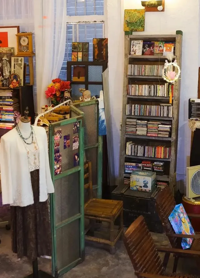 这一角堆着旧唱片和磁带,木梯子当书架,椅背蹭得发亮,盒带排成一条条银色的缝,播到卡带咔嗒一声卡住,拿铅笔往孔里一插,咯噔一转就活过来了。