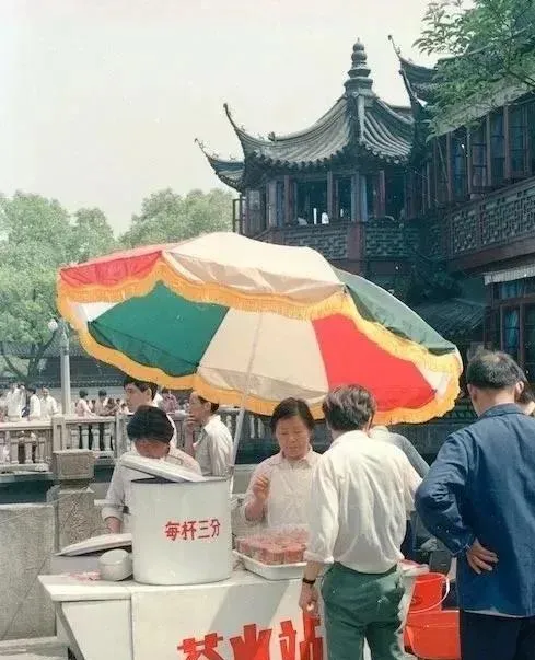 这个白桶连着遮阳伞就是茶水站,牌子上写着每杯三分,纸杯薄得透光,叔说那时候跑码头累得慌,喝上这一杯烫嗓子的茶,心里一下就踏实了。