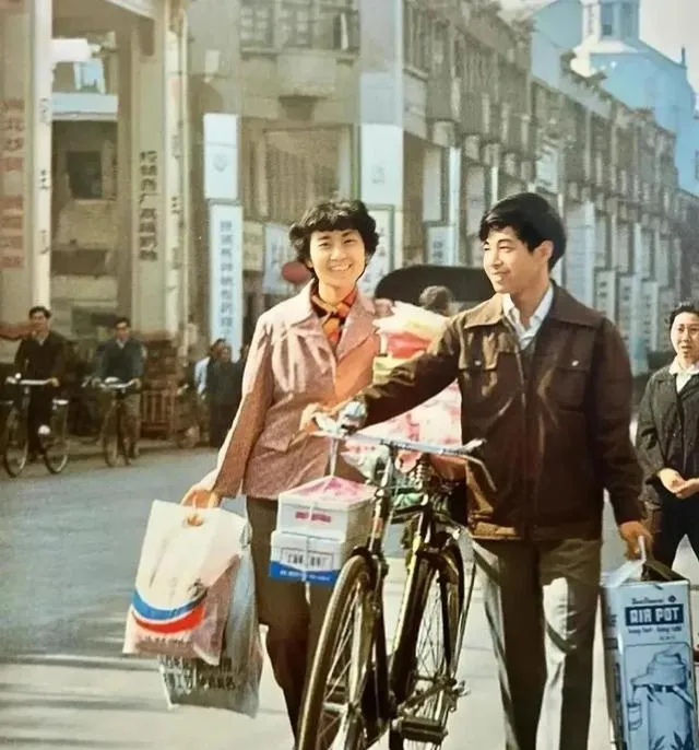 这对拎着袋子的年轻人,手里提着暖水壶和搪瓷盆,自行车推在身边,嘴里全是笑,妈妈说那会儿结婚就是三大件,加个手表就更体面,现在清单写不完,可心里的把握反而没以前实在。
