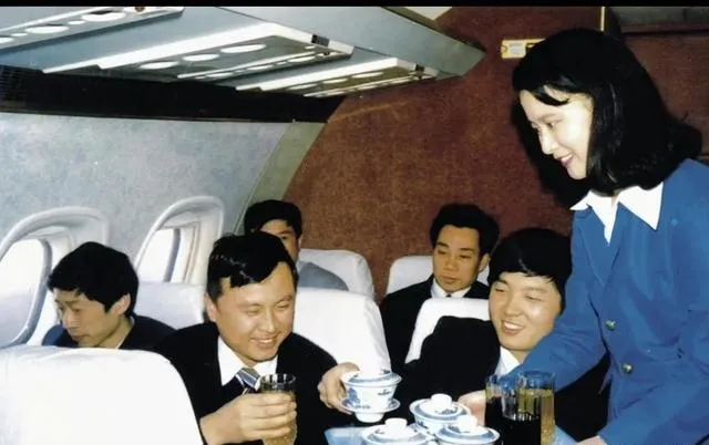这张机舱里的场景有意思,空姐端着托盘,蓝制服配微笑,托盘上居然摆着盖碗茶和玻璃杯果汁,茶汤晃一圈就冒香,叔叔说那时坐飞机得批条子的,位子不多,喝口热茶心里就踏实了,现在高铁飞机四通八达,咖啡奶茶随手点单,可这盖碗茶在云端的样子,真稀罕。