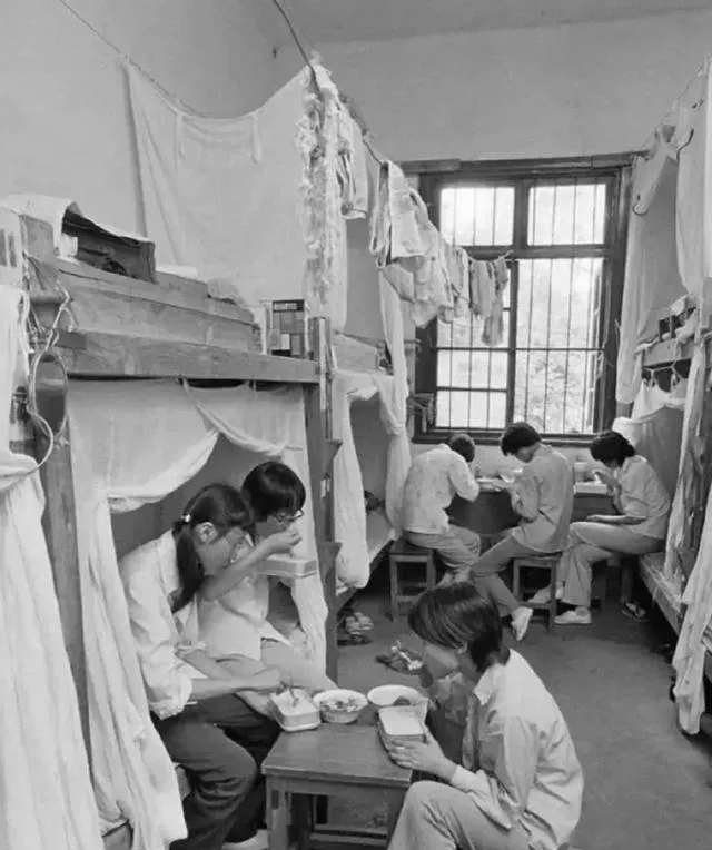 这个宿舍里的木床可结实,两层铺位刷着老清漆,床帘是白纱布,桌子矮矮的,铝饭盒叠着热汽,几个姑娘围着凳子小口扒饭,笑声挤在窗框里,我上高中住校也睡木床,翻身“咯叽”一响,整屋都知道谁醒了,现在宿舍换成铁架和收纳柜,干净是干净了,热乎的人情味反倒稀薄些。