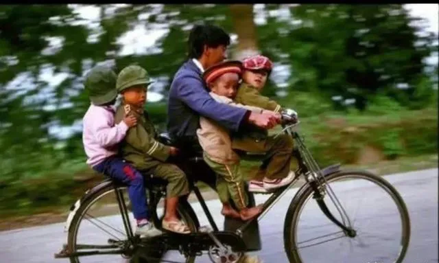 最后这位穿拖鞋的父亲骑着自行车,前梁坐一个,后座挤两个,最小的抱在怀里,四个孩子帽子大一号,路边树影在身后追着跑,我家的老凤凰也载过一家人去集上买年货,爸爸说抓紧了别打岔,现在汽车安全座椅讲标准,生活越过越好,可那股子把一家人带到一起的劲儿,永远值得被留住。