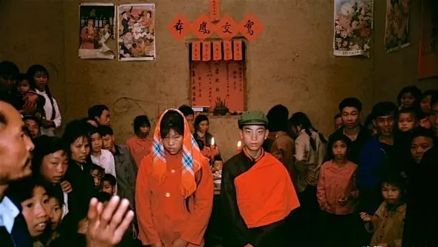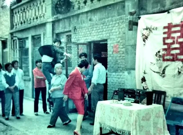 红双喜贴在被面上,桌上摆着搪瓷盆和糕点,放鞭的站在凳子上,火星子四处飞,新娘一身大红套裙,亲戚七嘴八舌,凑热闹才像婚礼嘛。