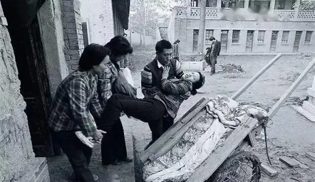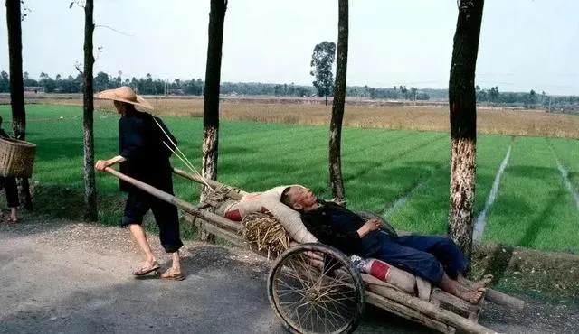 这个瞬间看着心紧,刚做完手术的妇女被家里人抬上架子车,毯子盖着,胳膊搭在家人的肩上,那时候医院远又穷,亲戚邻里一块儿帮着忙。
