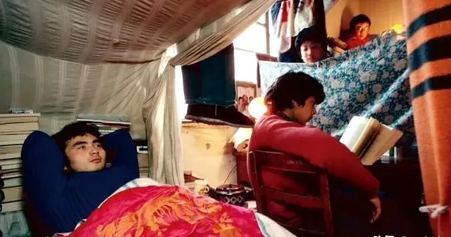 图里是大学宿舍,床帘低得快碰头,桌上堆满书,躺着的看天花板,坐着的埋头苦读,我在这画面里能闻到煤炉味,大红被面太熟了。