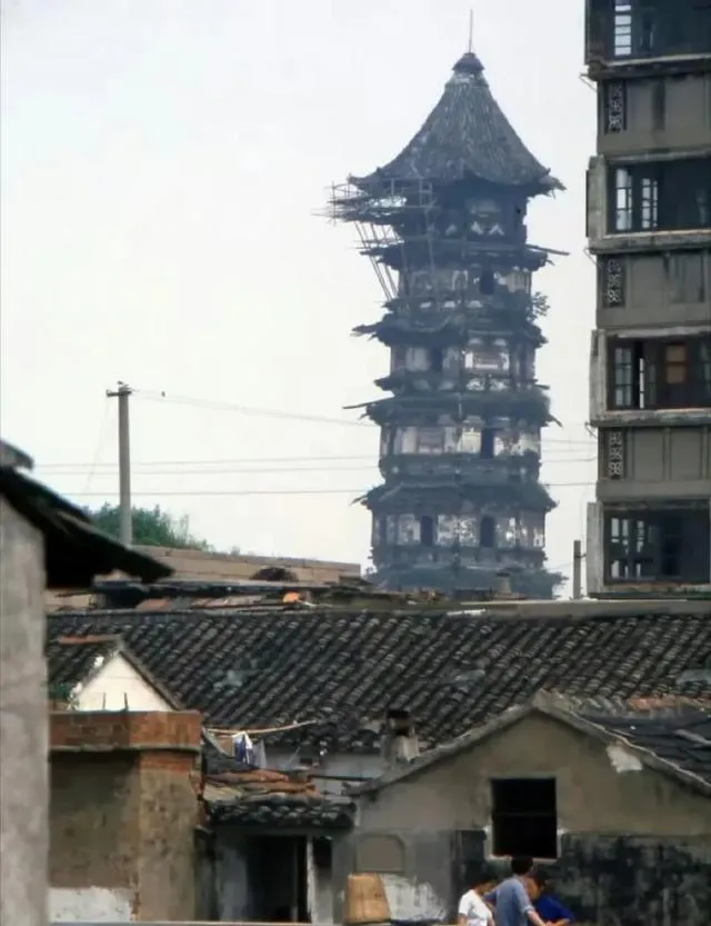 这塔身木梁外露,顶上黑瓦歪着,远近都是低平的瓦房,看着真替它捏把汗,可在那片天底下,它就是老邻居。