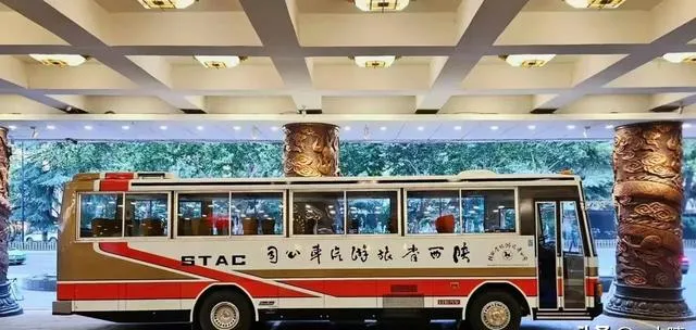 金红配色的旅游大巴一站在门廊下,车身刷着醒目的字,导游举着小旗,照相机咔嚓咔嚓,能跟团出去走一遭可风光了。