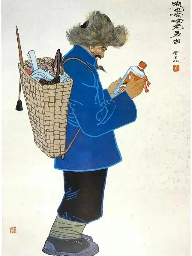 这张画上穿蓝棉袄的叫背篓老汉,麻绳勒肩,脚上千层底,手里捏着一瓶白酒眯眼看,像是第一次见到印着彩标的新包装,小时候我在供销社门口等爹,他买的也是这味道,回家烫两口,脸一下通红。