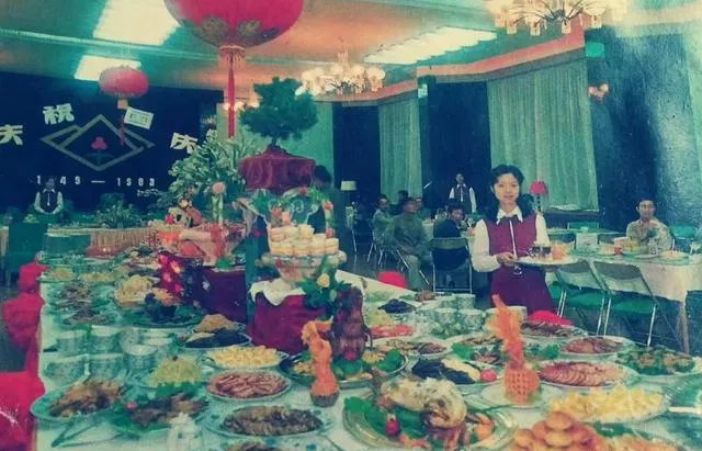 桌上叫拼盘山水,萝卜雕狮子,蛋糕叠塔,银盘一溜亮堂堂,穿红马甲的服务员腰板笔直,这阵仗在当年已是足够惊艳,现在酒店自助随便挑,可少了那股子单位荣光的气。