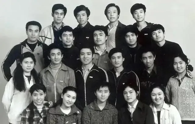 这张照片叫剧校大合影,运动装外套一水儿的拉链领,有人笑得腼腆,有人耍帅抬下巴,老师说里面好几个后来都成了戏骨,确实一看就灵气逼人。